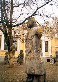 Stone Women ![]() Most inhabitants of the city and visitors know and like the distinctive features of the small square near the Museum of History - the place where the Stony Women stay (which actually are not females...). The visitors are amazed with the centuries-old natives - their oval forms. They were ancient creations of the steppe nomadic people and are a modular collection from neighboring barrows. In the past they served as the index points for the steppe inhabitants. The first century of the new era was marked by fast inhabitation of the Dnieper River banks by Slavic tribes. The rocks of Monastyrskiy Island remember well the first time Slavs floated down the Dnieper River to the Black Sea and the Mediterranean. On this island in the IX century the Monastery was founded by Byzantian monks (from it the island received its name). It existed until 1240 when it was destroyed by Tatars. The Dnieper River has for many centuries served as a border between East and West and its banks have served as arena of struggle between the Slavs and the Asian nomads. This situation continued for many centuries until the XV century when there appeared a new force - the free people - Cossacks - Zaporiz'ki Kazaky (Zaporizhya - the lands south of Prydniprovye, translate as "The Land After the Weirs [Rapids]")...