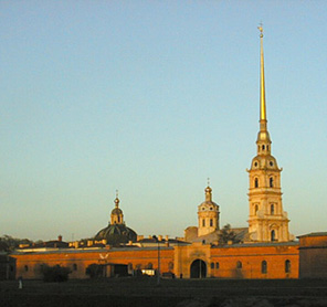 THE PETER AND PAUL FORTRESS![]() This stronghold was built to secure Russia's hold on the Neva delta and is the seed of this famous city of now more than 5 million residents. Native villagers were forced to labor from sun up to sun down on Zayachiy (Hare) Island in order to construct the Fortress within a seven month period during 1703. During 1718 the Fortress was utilized as a prison, known, ironically as the "Russian Bastile." Today the island is a favorite with sunbathers, and in the winter with the "walruses", people who swim in the frigid waters. Inside the cathedral which is the spire you see here, you will find the final resting place for several former rulers.